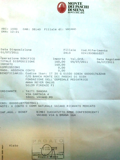 - 160 euro alla FONDAZIONE MAYER - vedi copia bonifico -